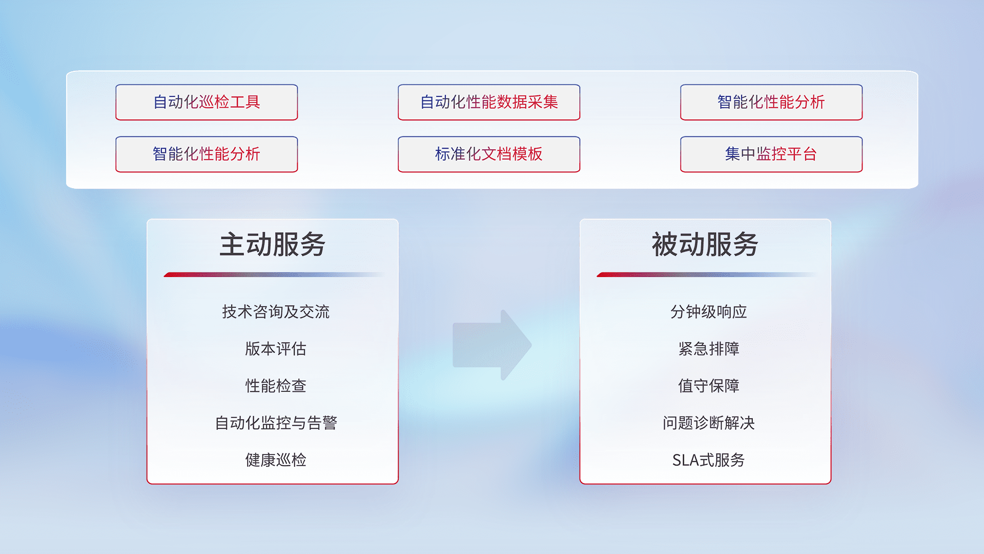 智能化工具和标准化文档,,,保障服务质量,,,,提供主动服务(包含技术咨询、、、版本评估、、、性能检查、、、、自动化监控与告警、、、、健康巡检)和被动服务包含(分钟级响应、、、、紧急排障、、、、值守保障、、问题诊断解决、、、、SLA服务)。。