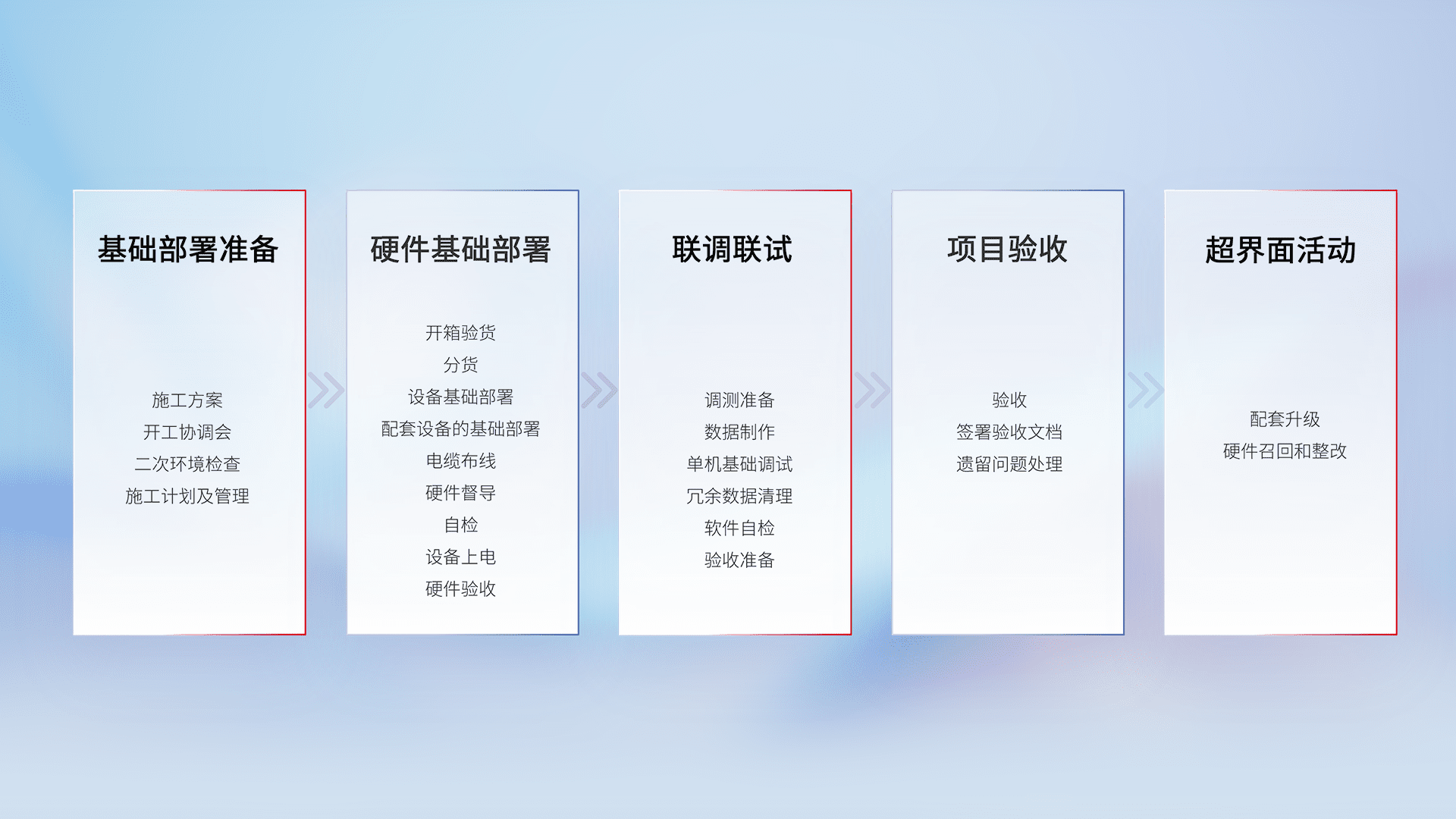 从基础部署准备、、、、硬件基础部署、、、联调联试、、项目验收、、、、越界面活动的全过程可追溯,,保证施工质量和进度。。